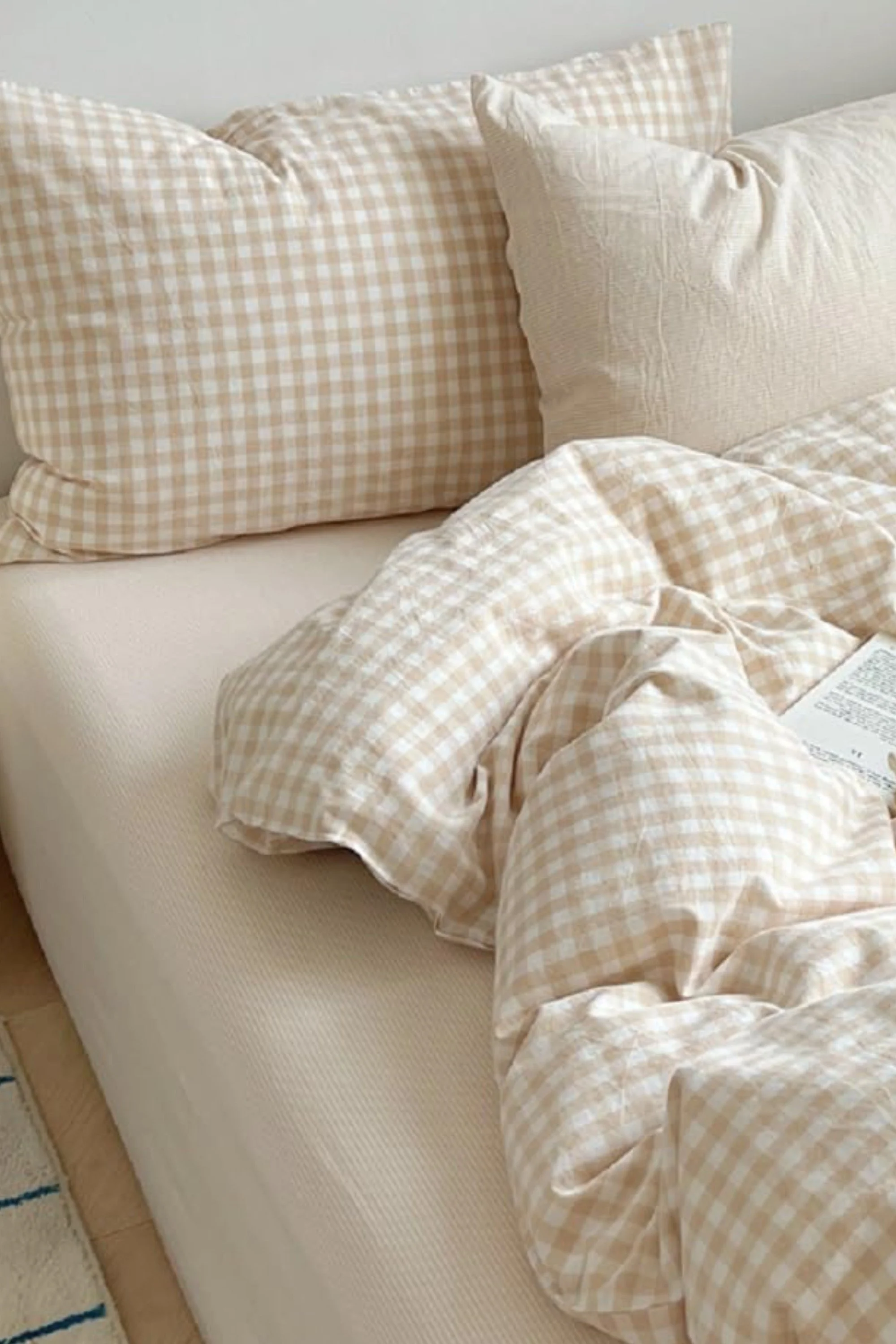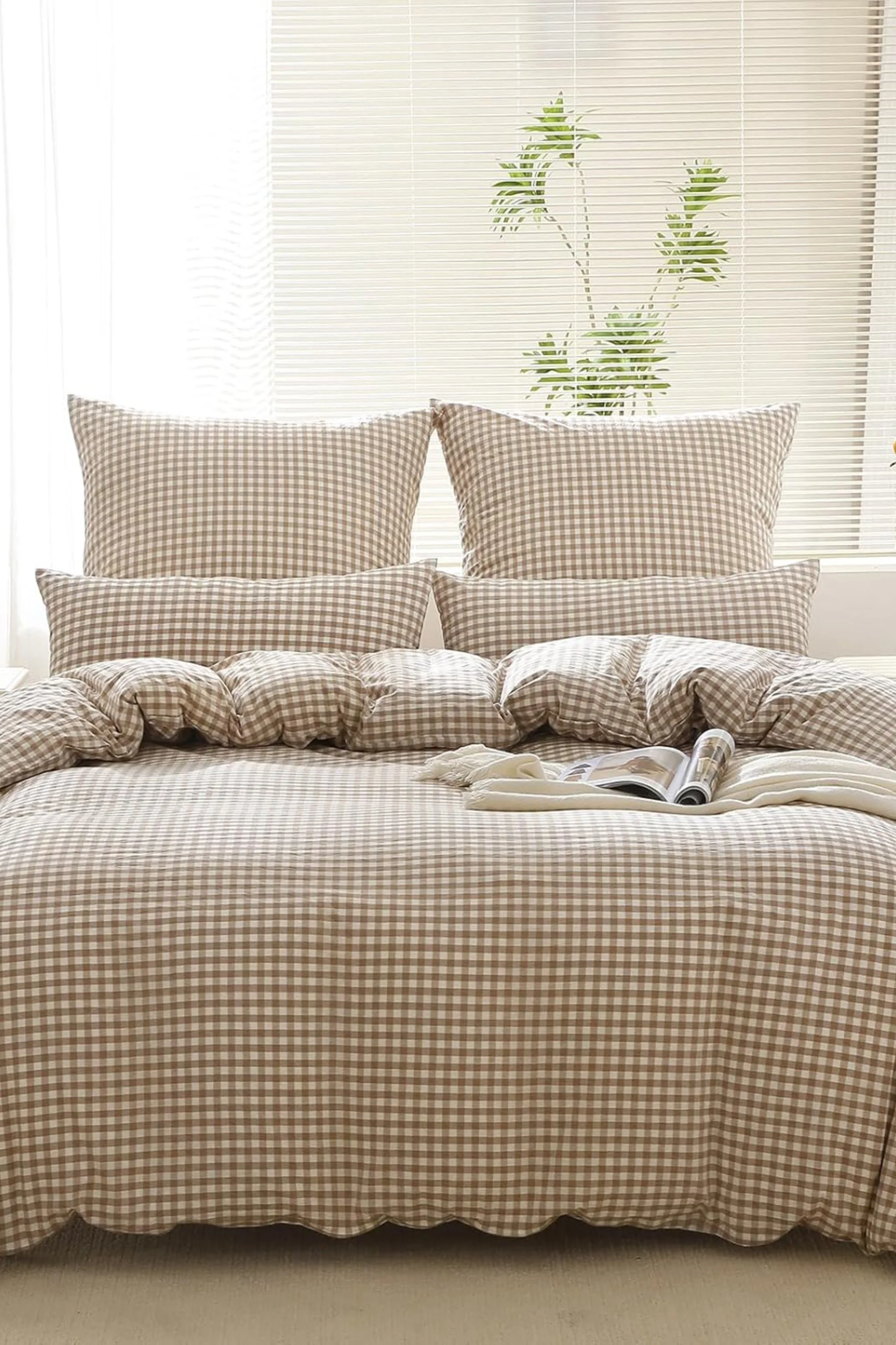 Les carreaux marron et beige donnent à cette parure de lit une atmosphère douce et réconfortante, parfaite pour une chambre chaleureuse. On imagine facilement un lit douillet, une lumière tamisée et une soirée tranquille sous la couette. C’est le genre de linge de lit qui transforme la chambre en véritable cocon.
