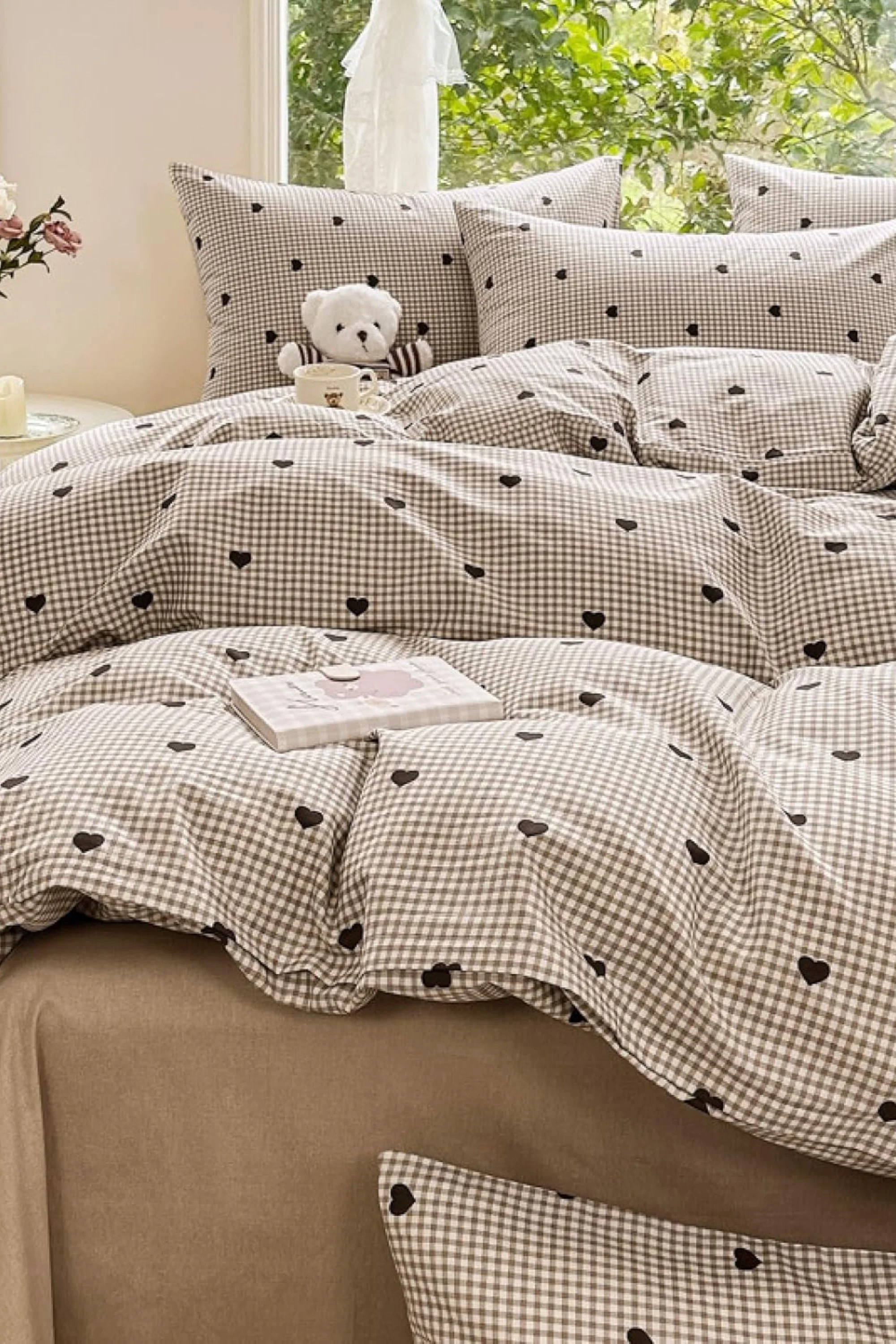 Avec son motif vichy et ses petits coeurs, cette housse de couette apporte immédiatement une ambiance douce et chaleureuse à la chambre.