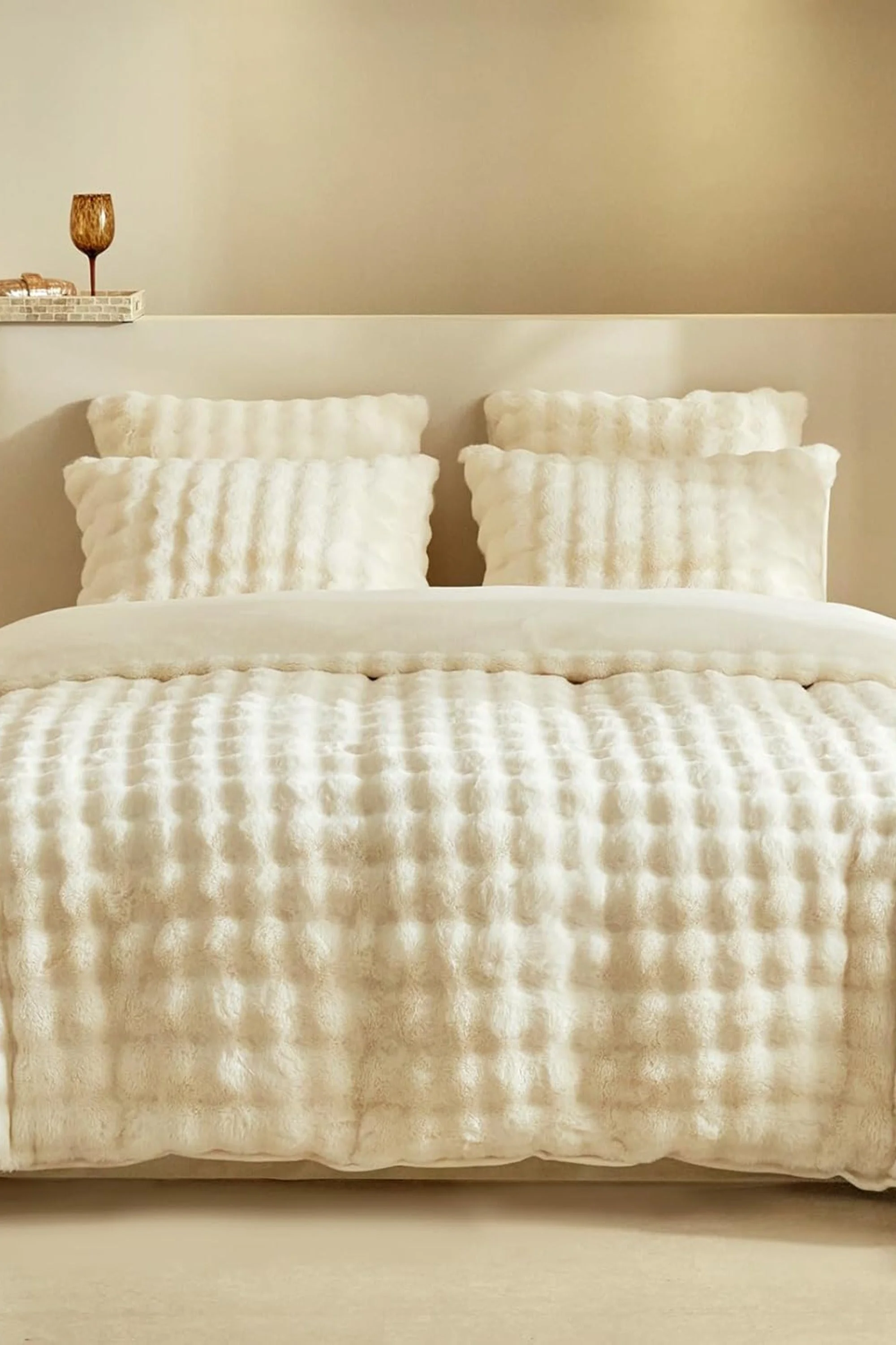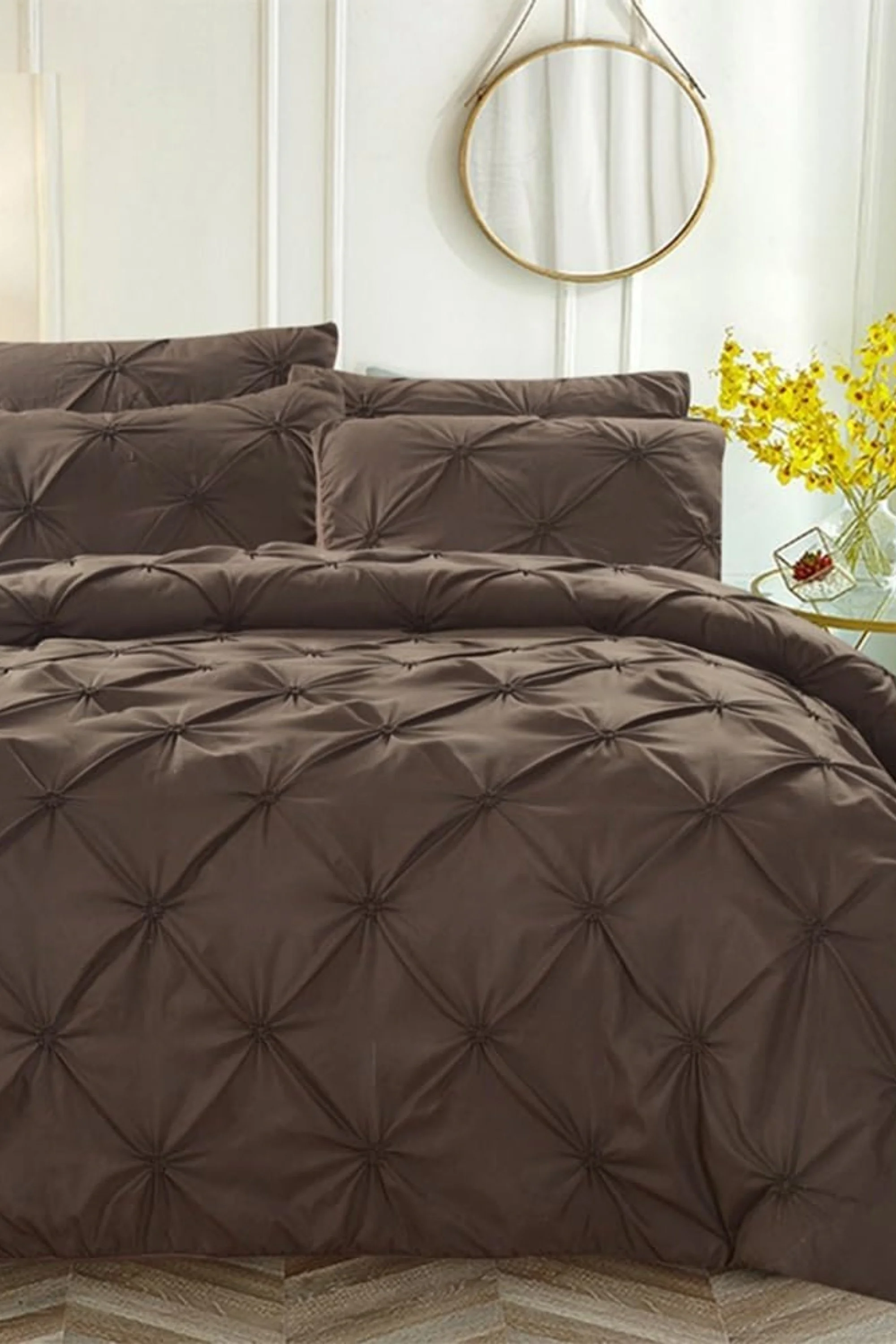 Cette parure de lit marron capitonnée crée immédiatement une ambiance enveloppante et élégante. La texture en relief donne du caractère au lit tout en gardant une atmosphère douce, parfaite pour une chambre chaleureuse et apaisante.