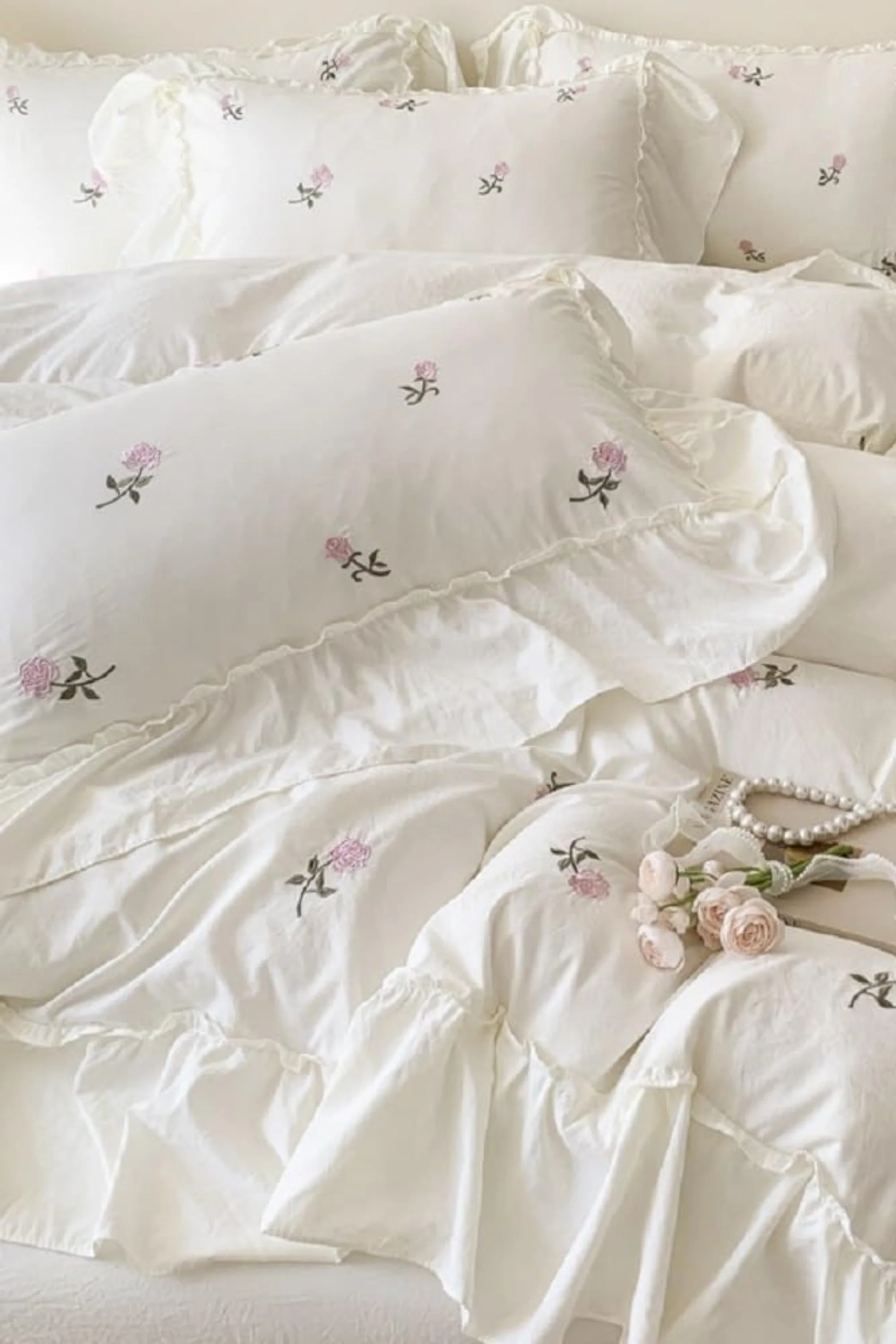 Les petites fleurs brodées et les volants délicats donnent à cette parure de lit un charme romantique et intemporel. Elle évoque une chambre douce et lumineuse, où chaque détail invite à se détendre et à profiter d’un lit confortable et apaisant.