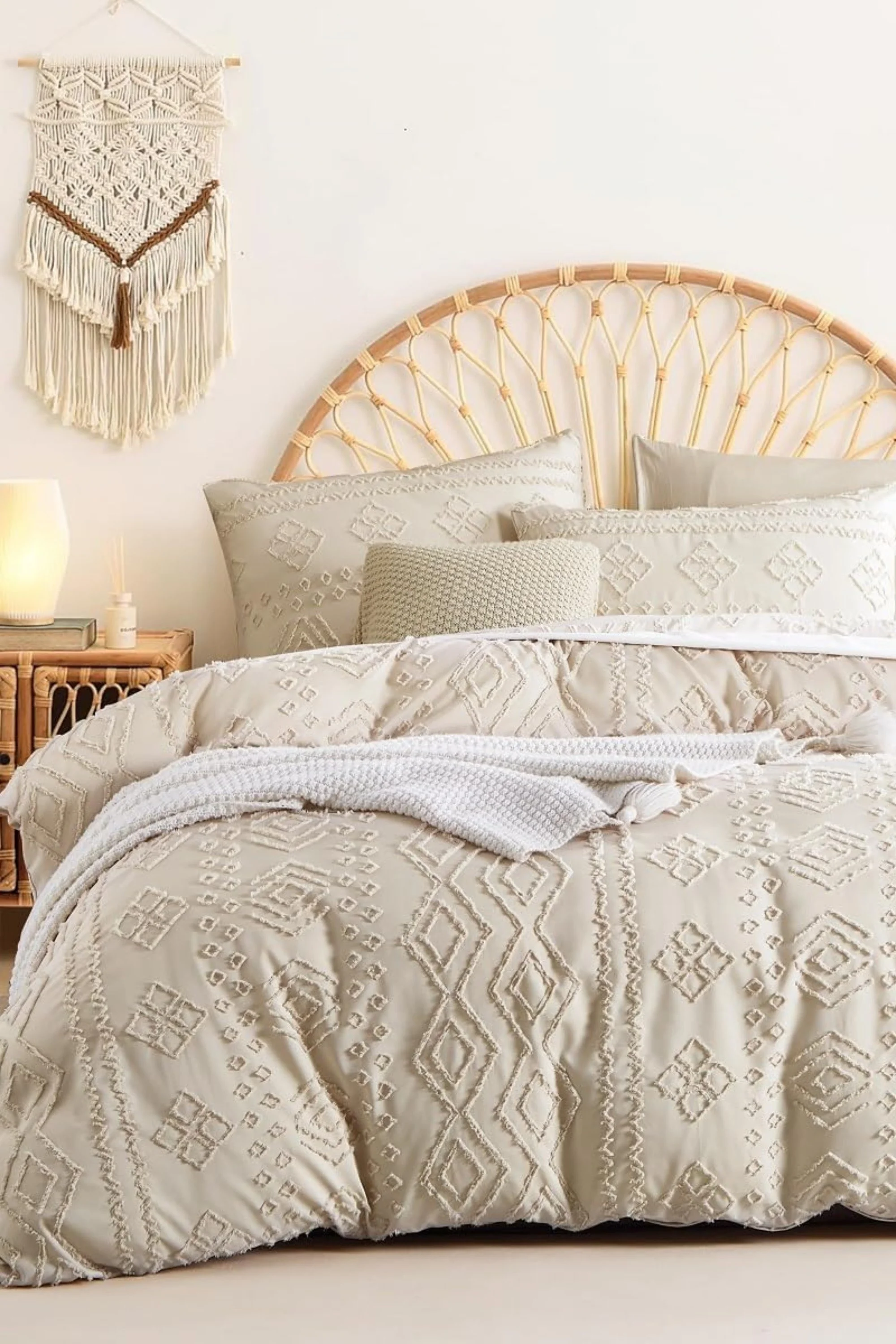 Les broderies en relief et les motifs géométriques donnent à cette parure de lit une allure douce et artisanale. Elle évoque une chambre calme, lumineuse, presque méditative, où l’on a simplement envie de ralentir et de se glisser sous la couette.