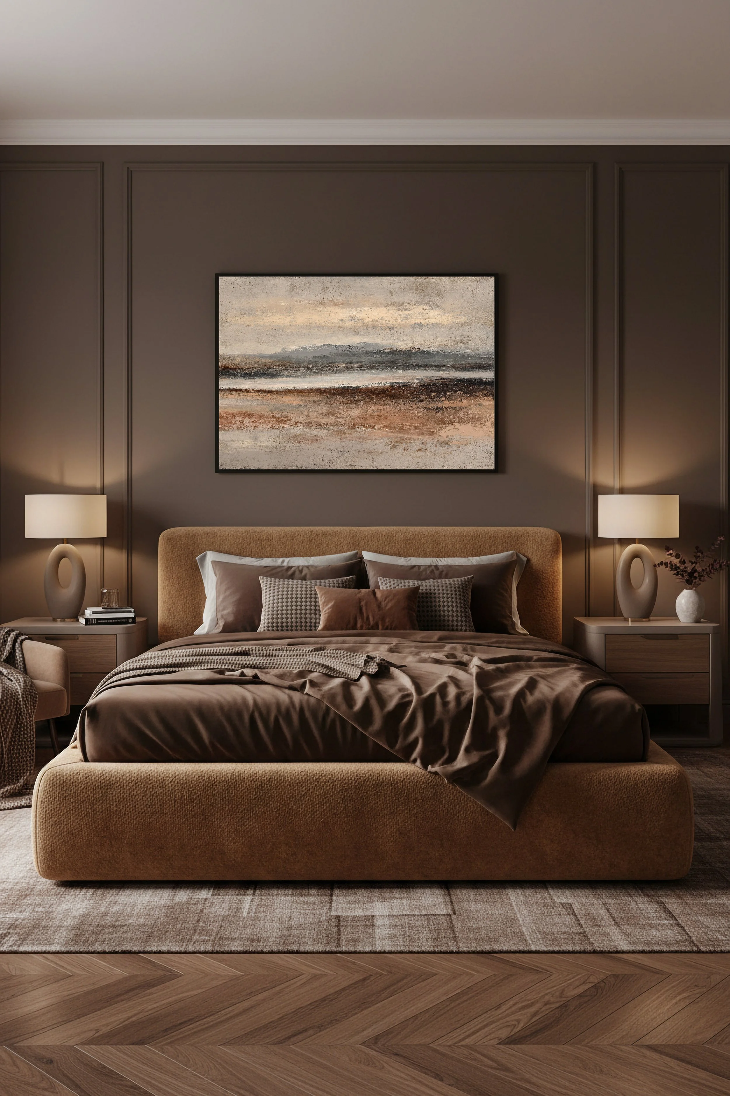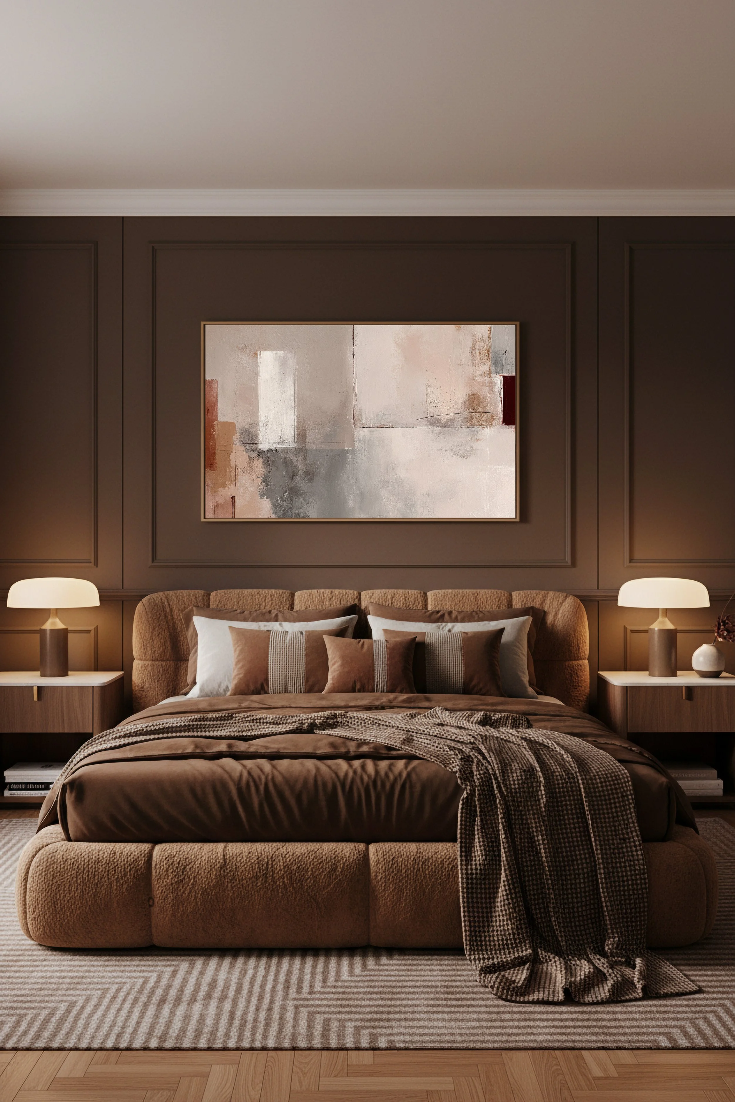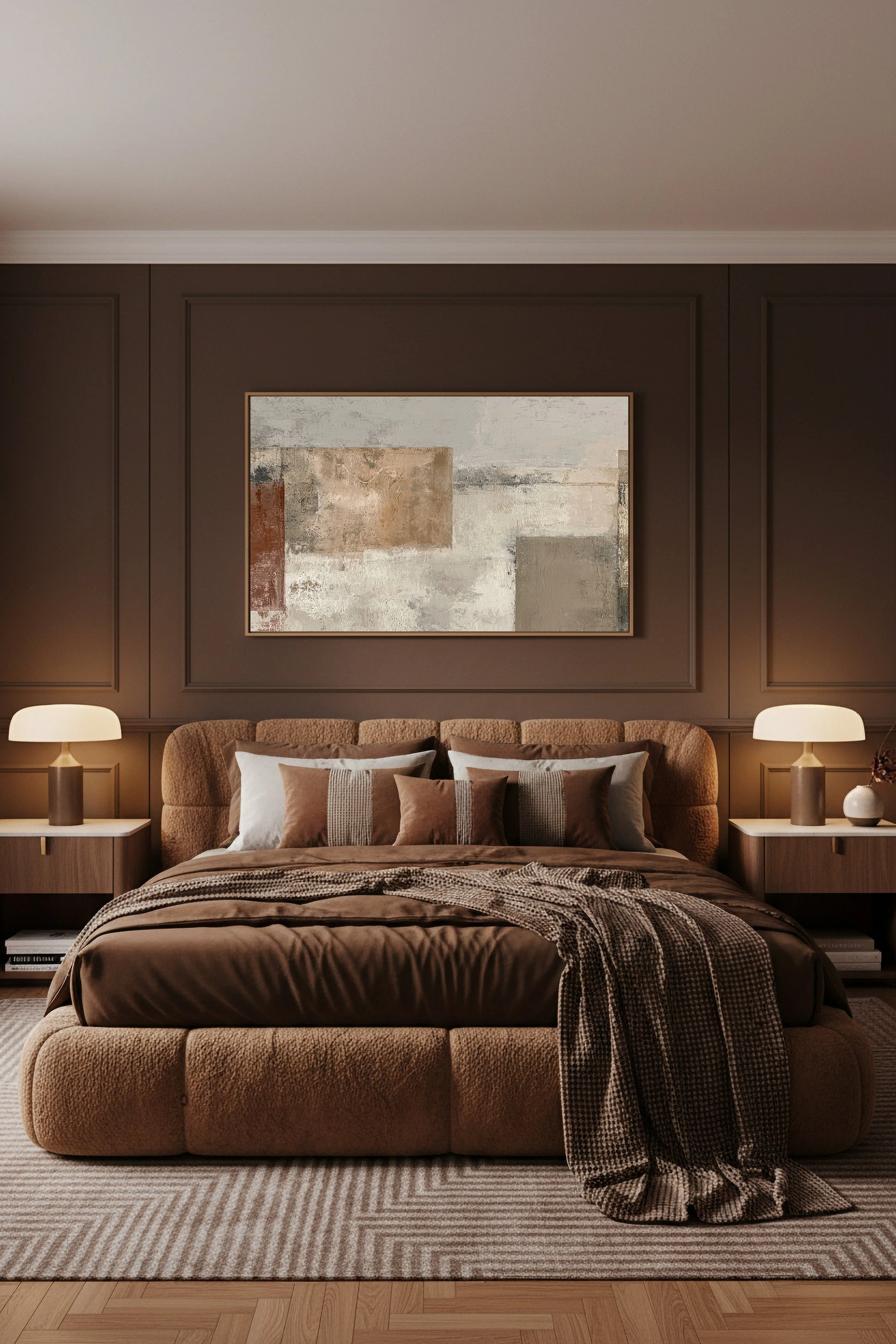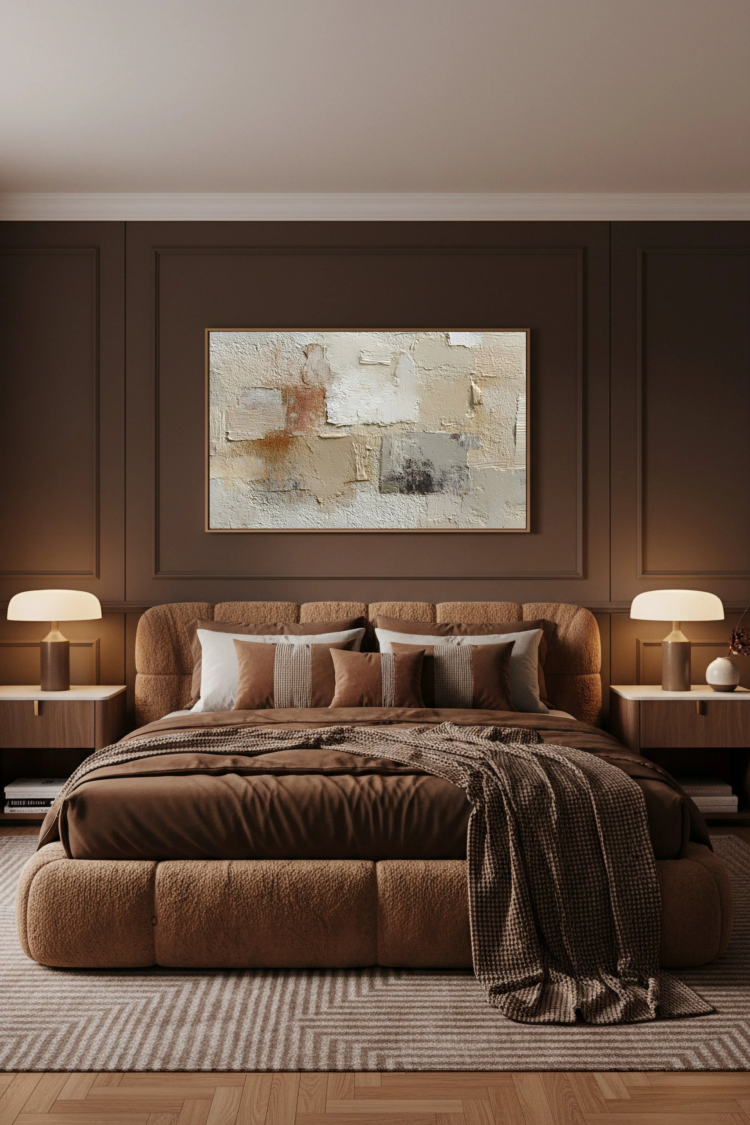 Ce tableau abstrait aux tons beige, sable et brun apporte une atmosphère chaleureuse et sophistiquée à une chambre.