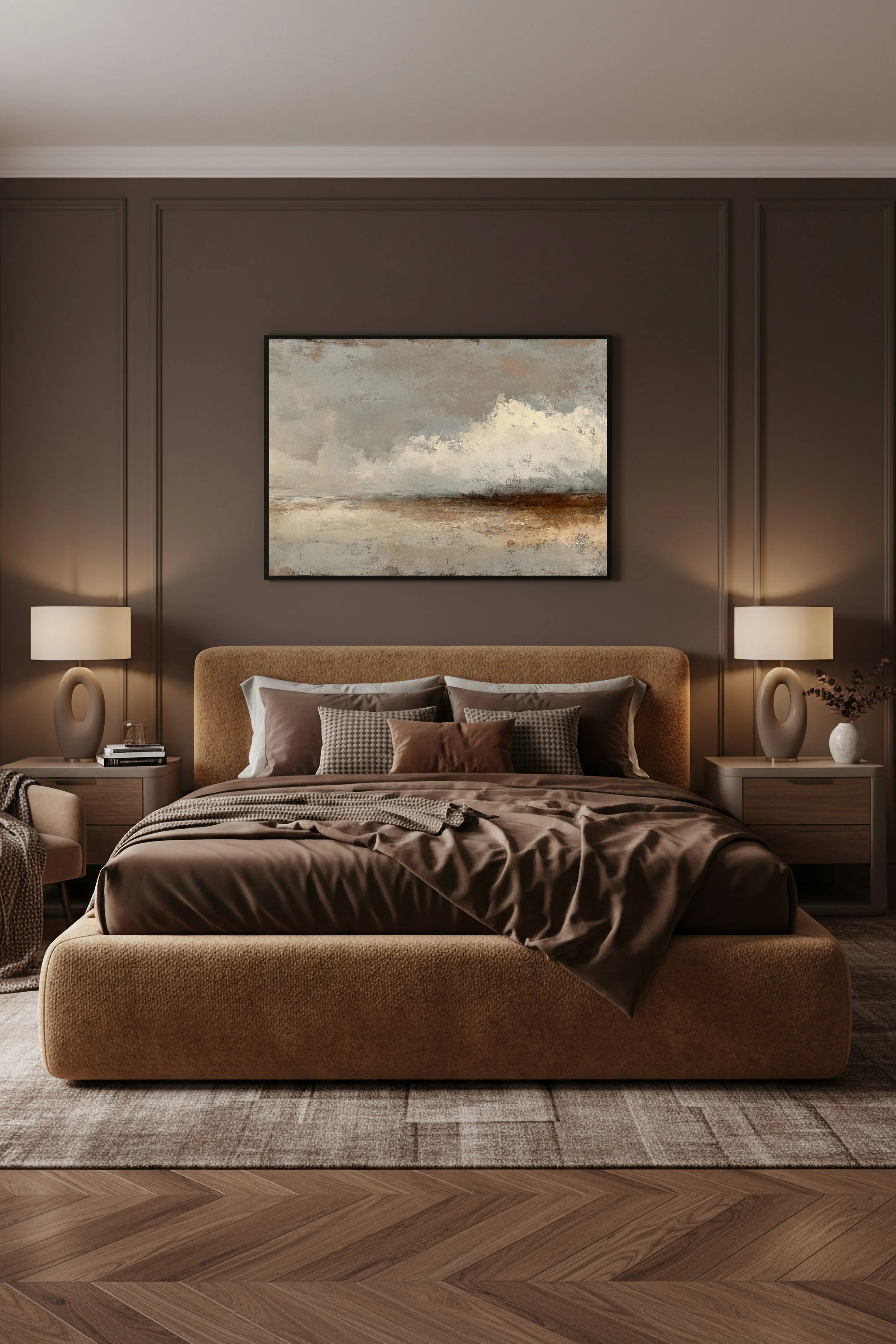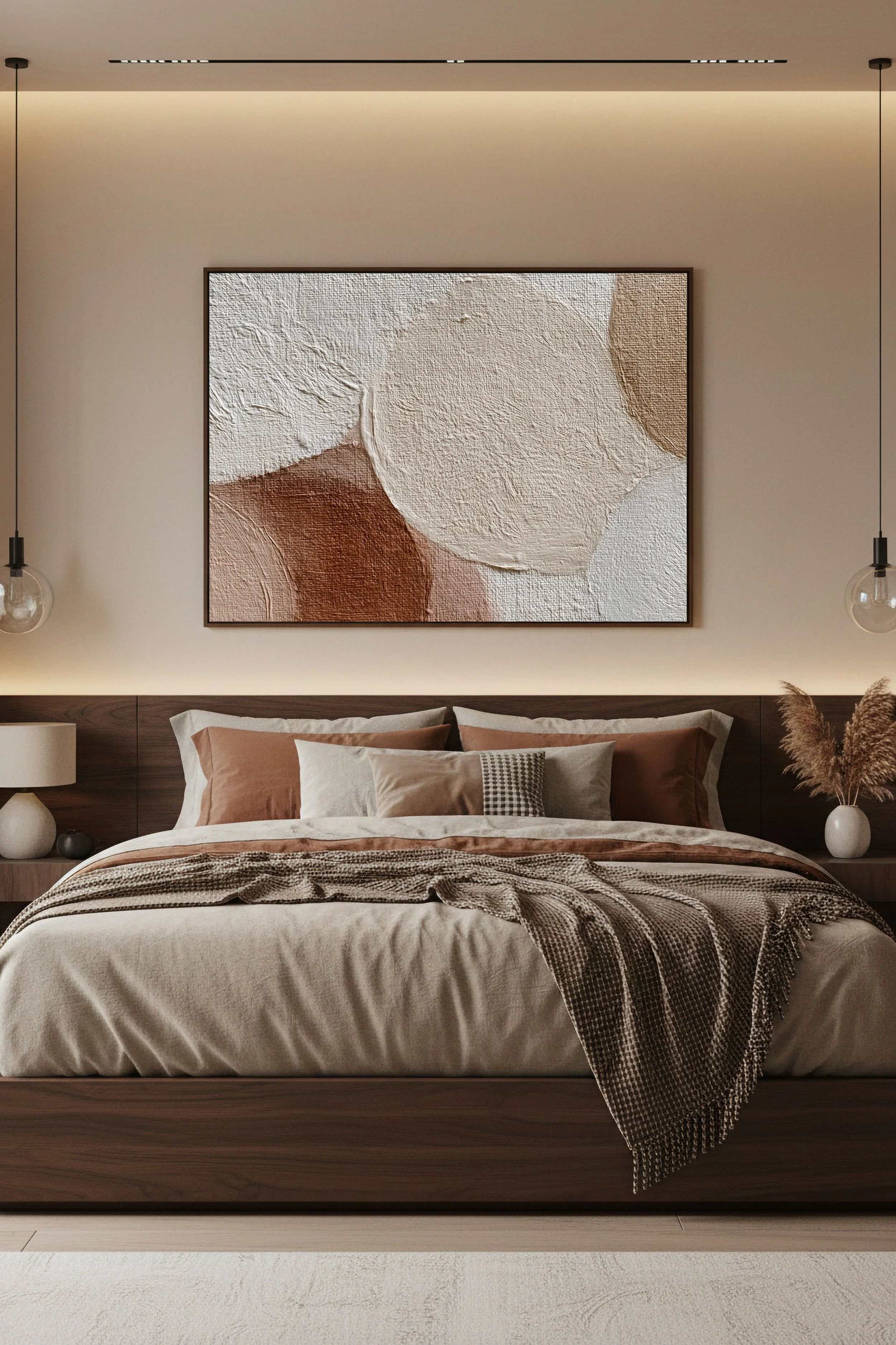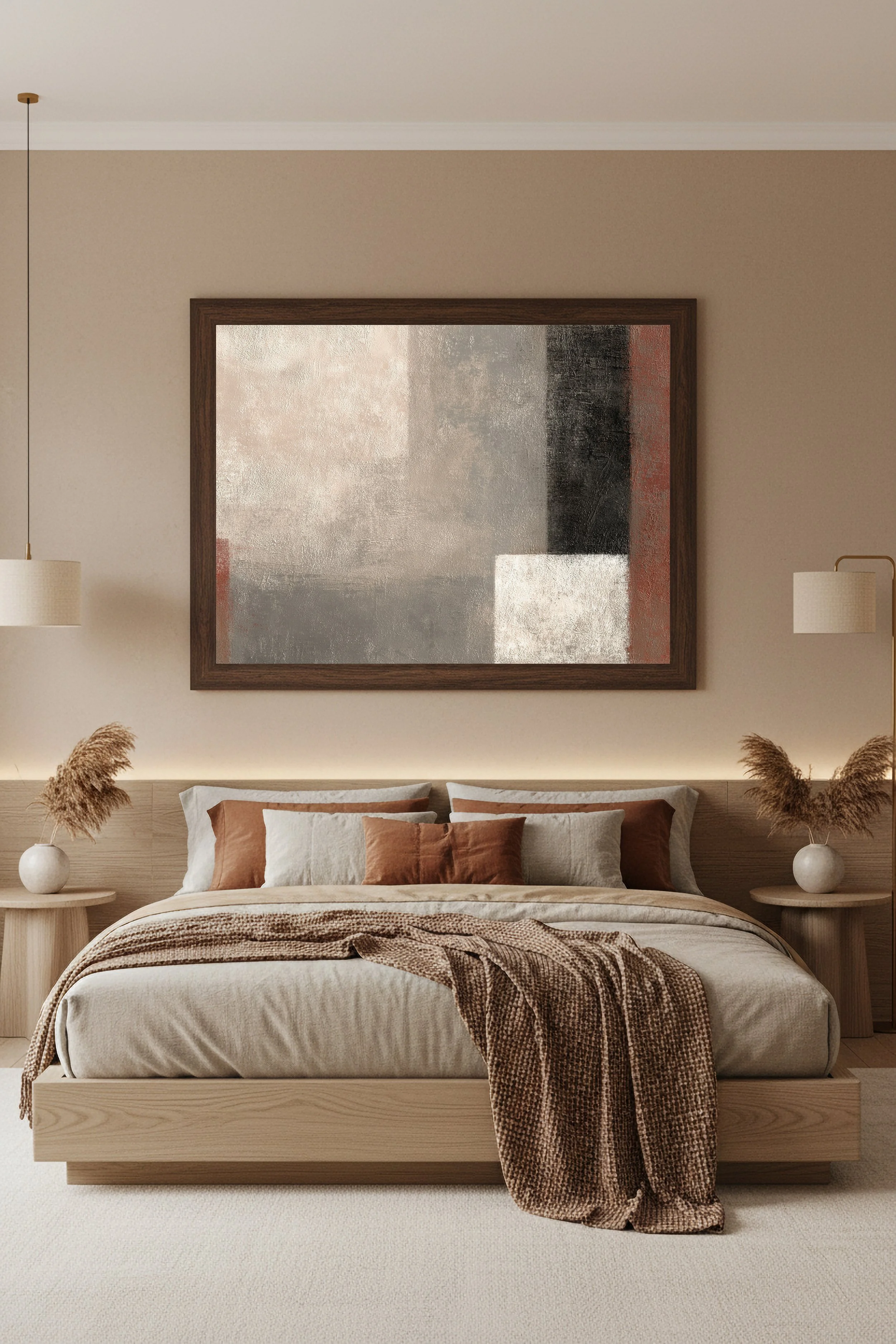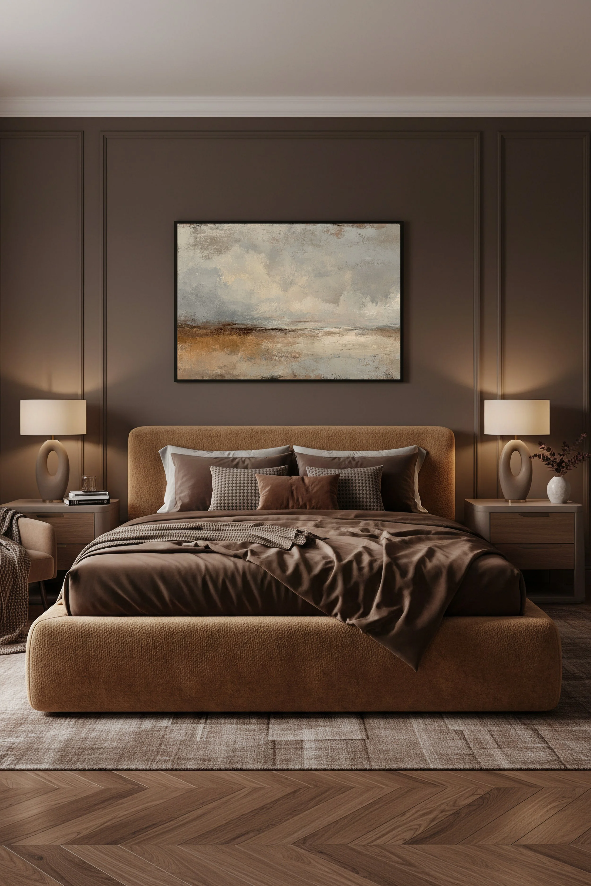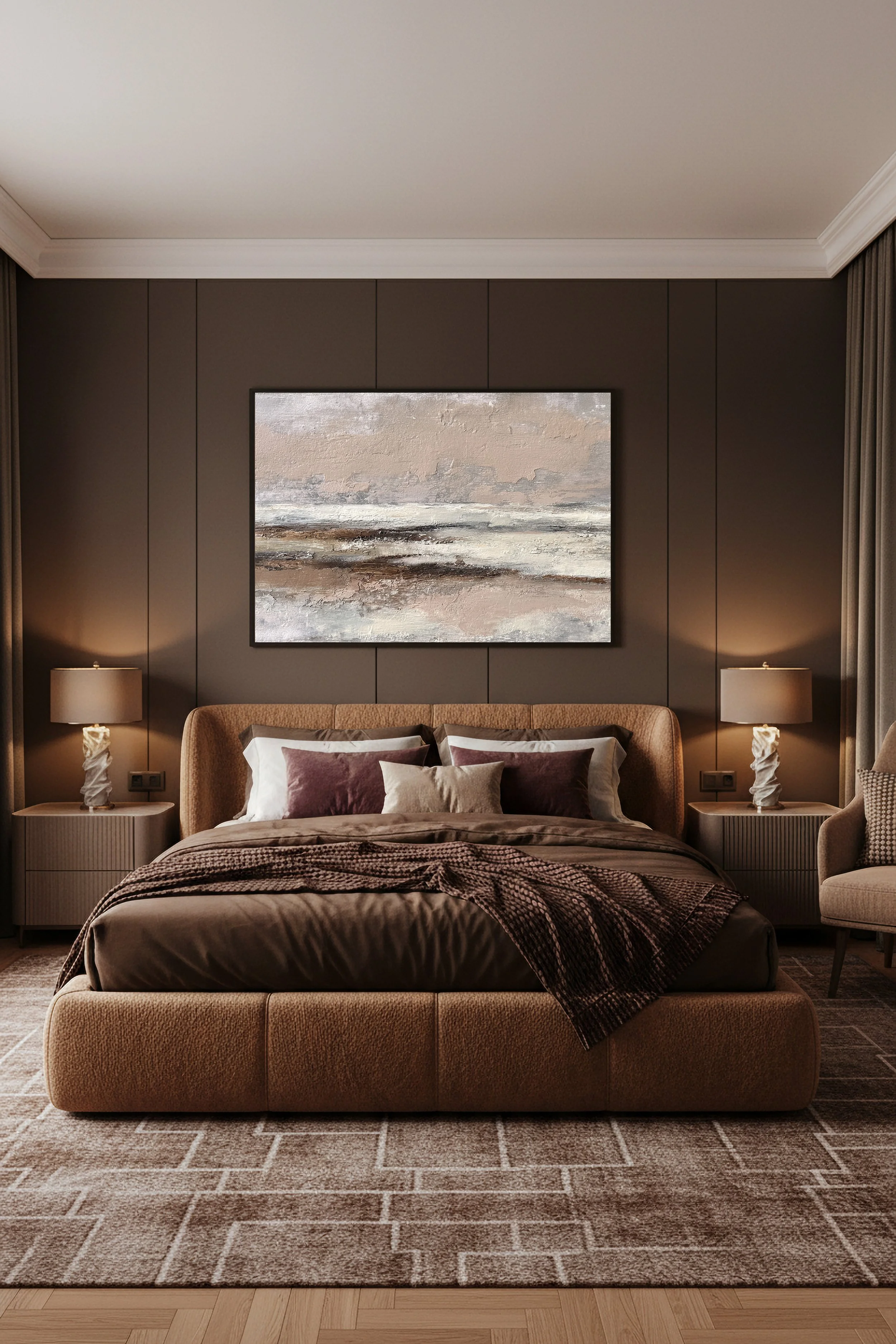 Ce tableau abstrait aux tons beige, sable et brun apporte une atmosphère chaleureuse et sophistiquée à une chambre.