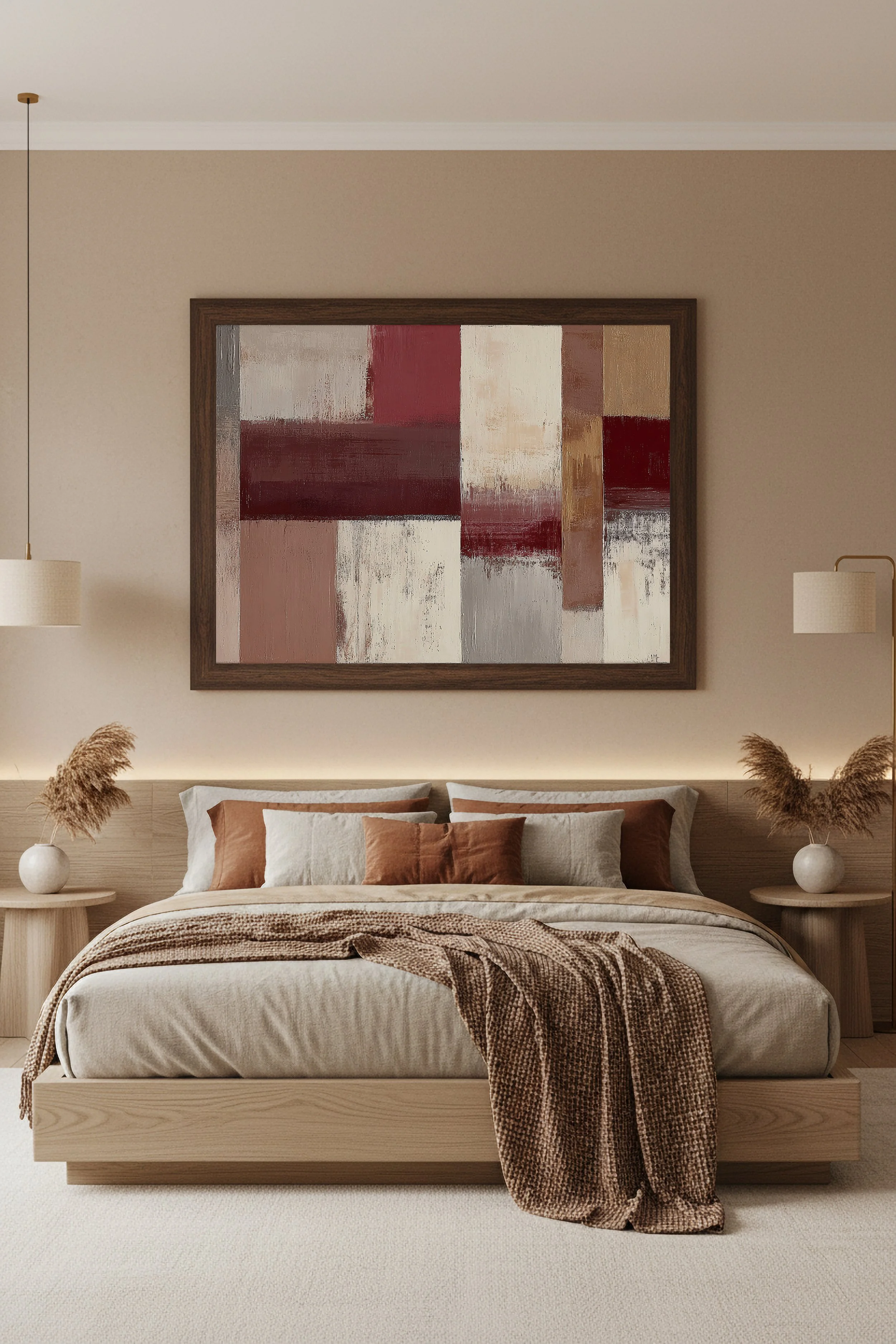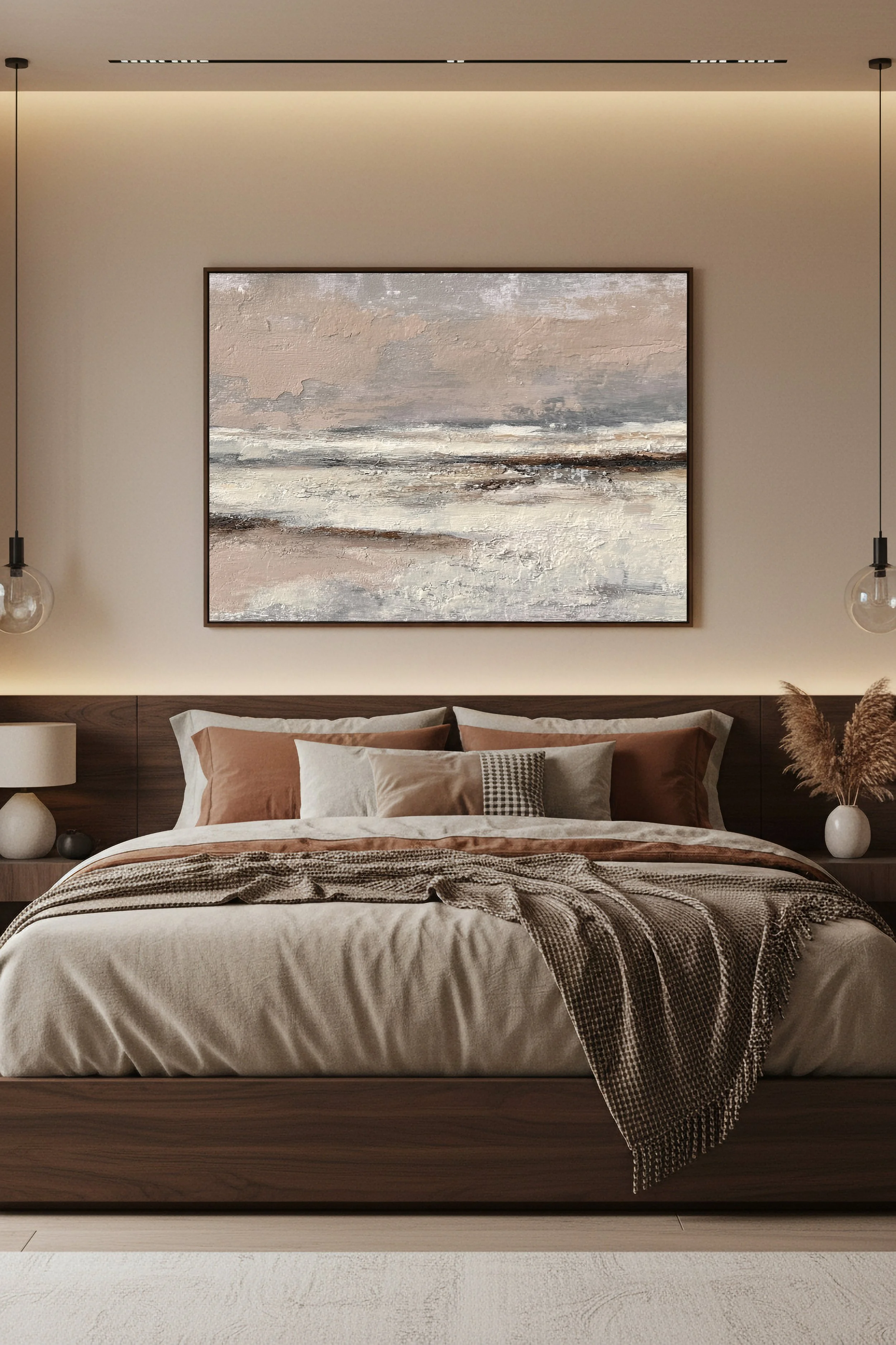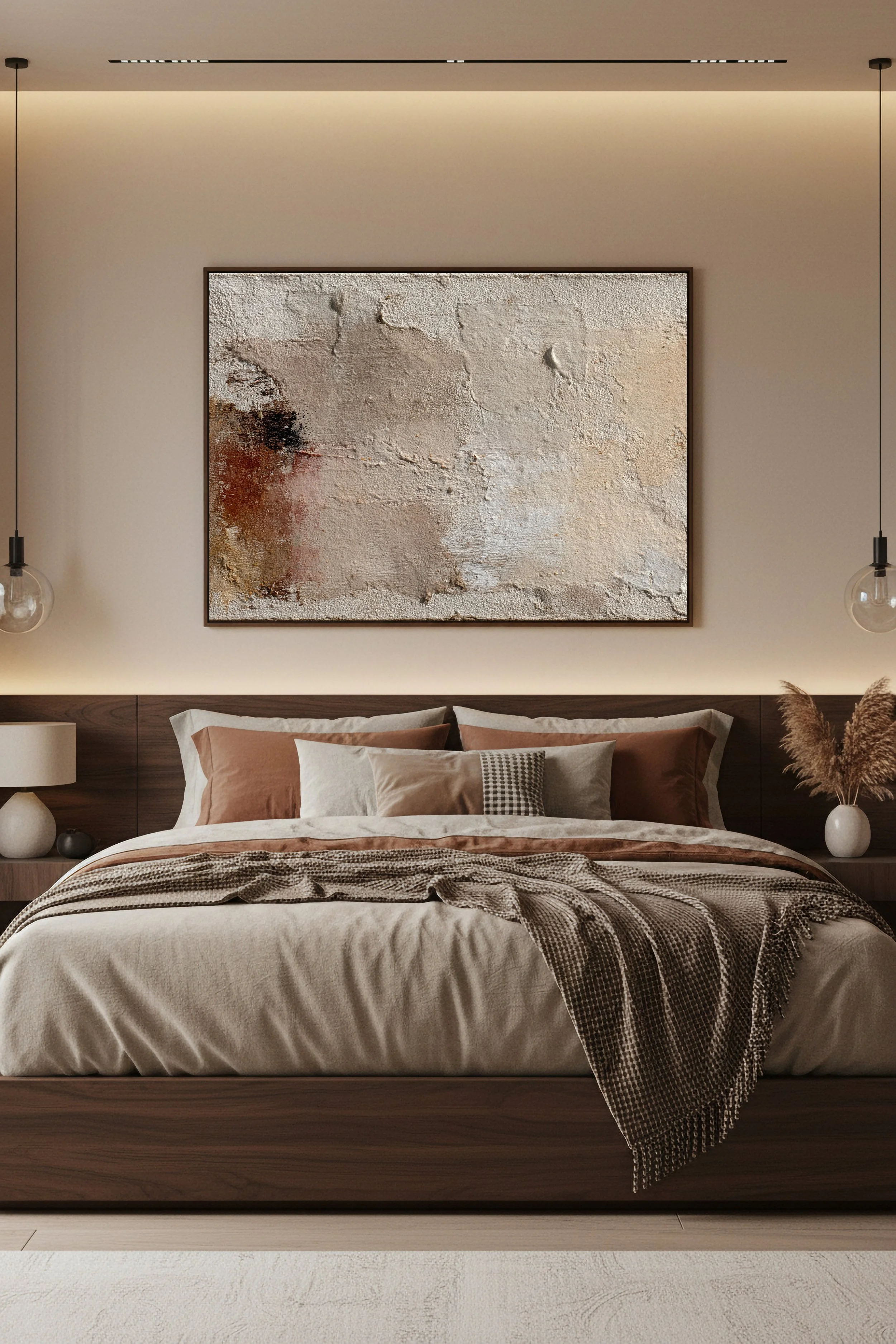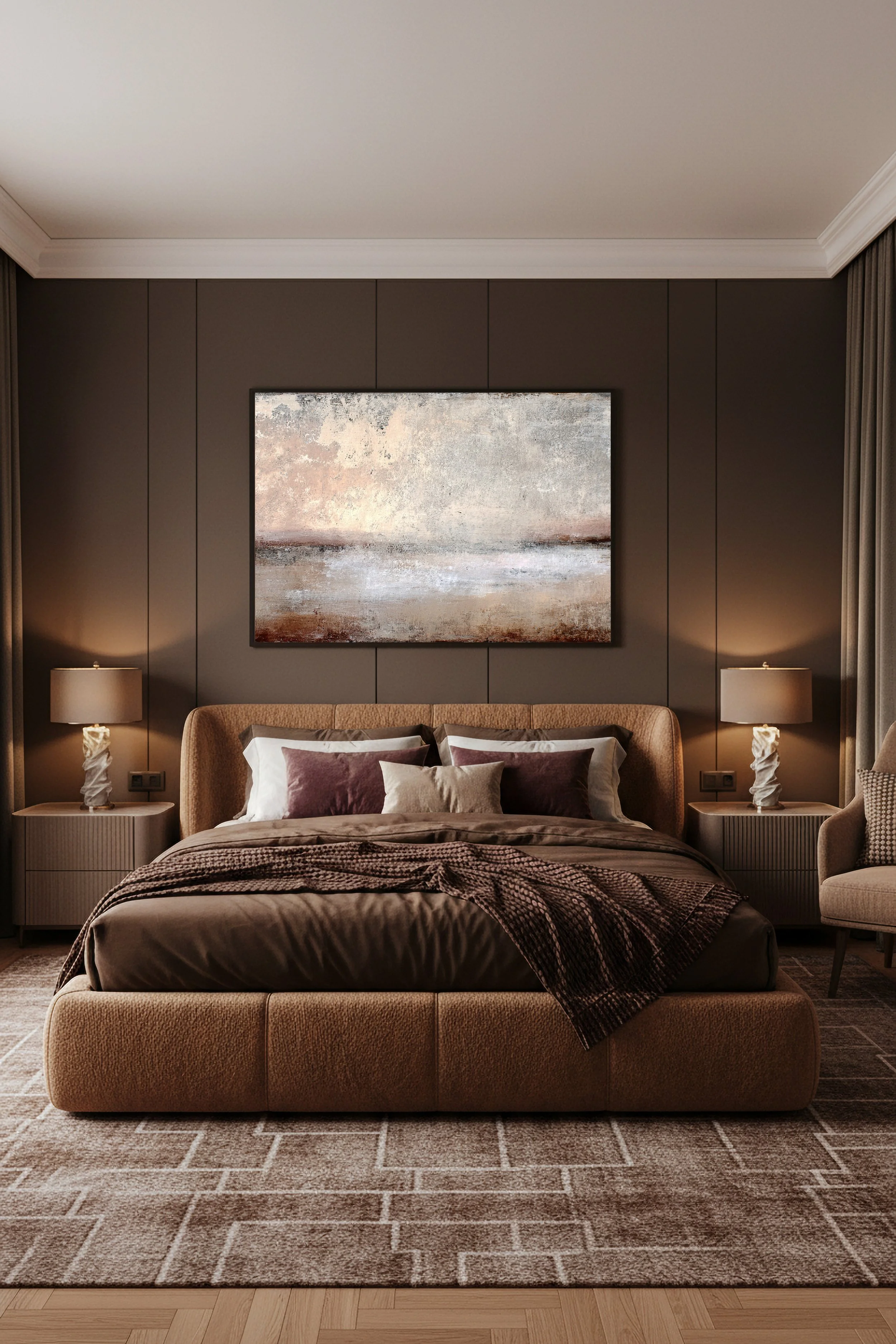 Ce tableau abstrait aux tons beige, sable et brun apporte une atmosphère chaleureuse et sophistiquée à une chambre.