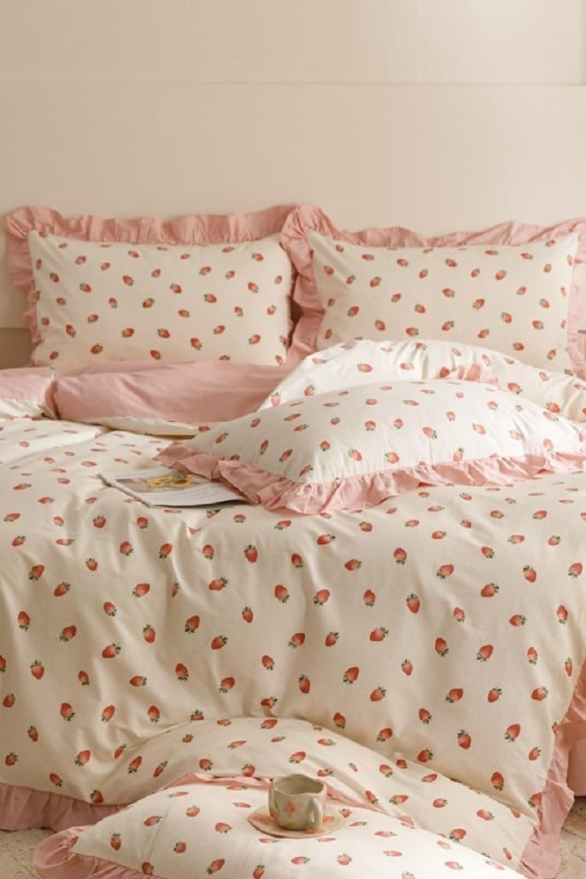 Une parure de lit à motif fraises, idéale pour créer une chambre douce, originale et délicieusement cosy.