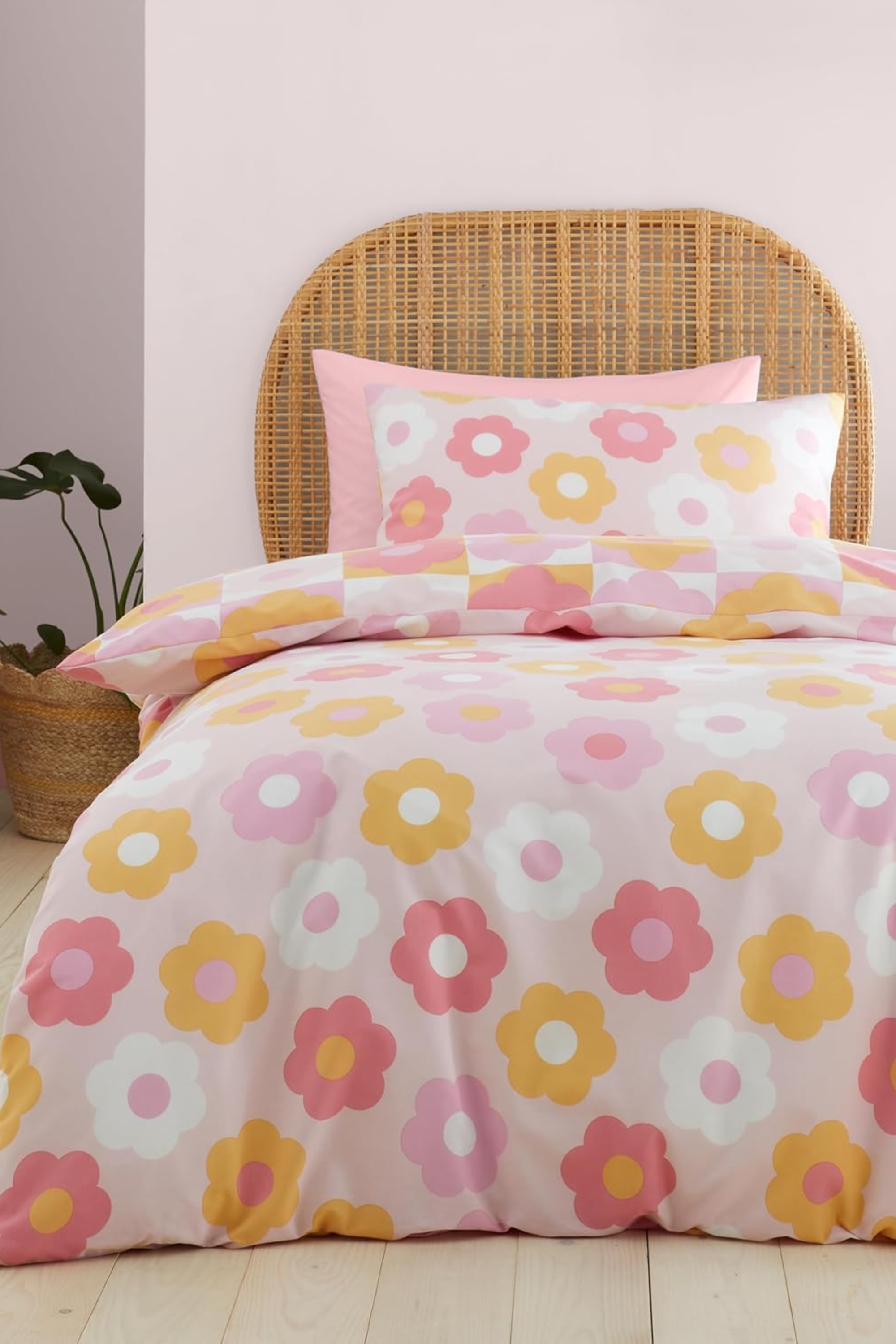 Parure de lit fleurie aux tons rose, jaune et blanc, parfaite pour apporter une ambiance fraîche, douce et printanière à la chambre.