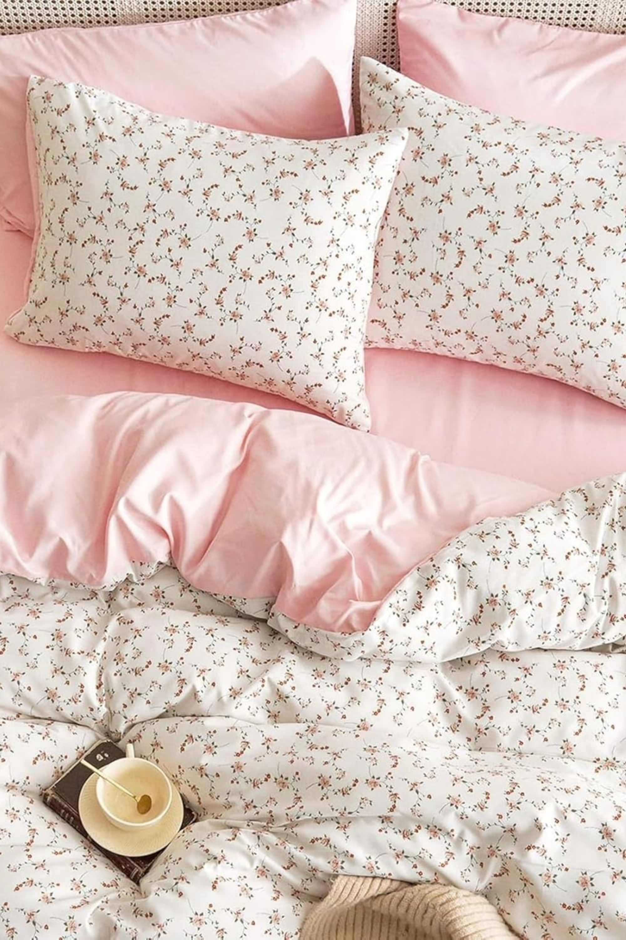 Une parure de lit fleurie rose, parfaite pour créer une chambre douce, lumineuse et délicatement printanière.