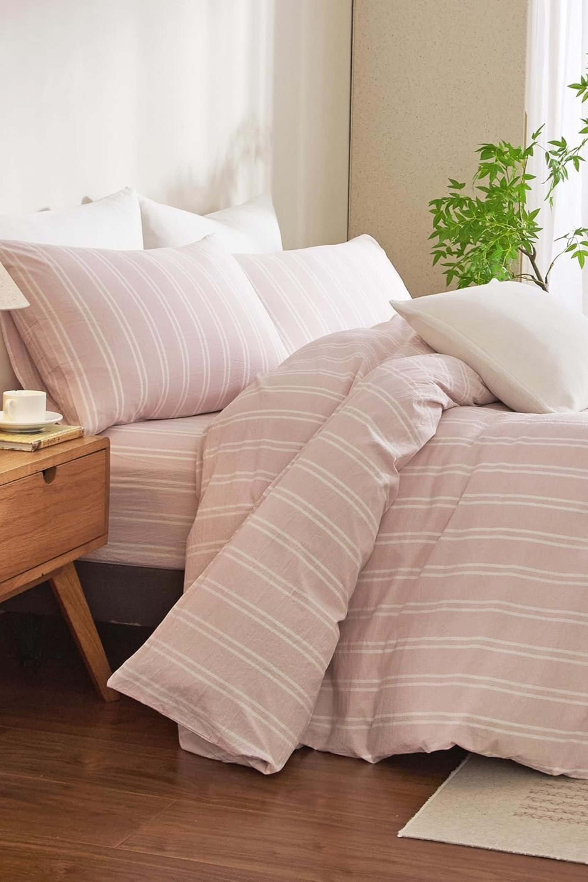 Une parure de lit rose poudrée à rayures, parfaite pour créer une chambre cosy, lumineuse et élégante au printemps.