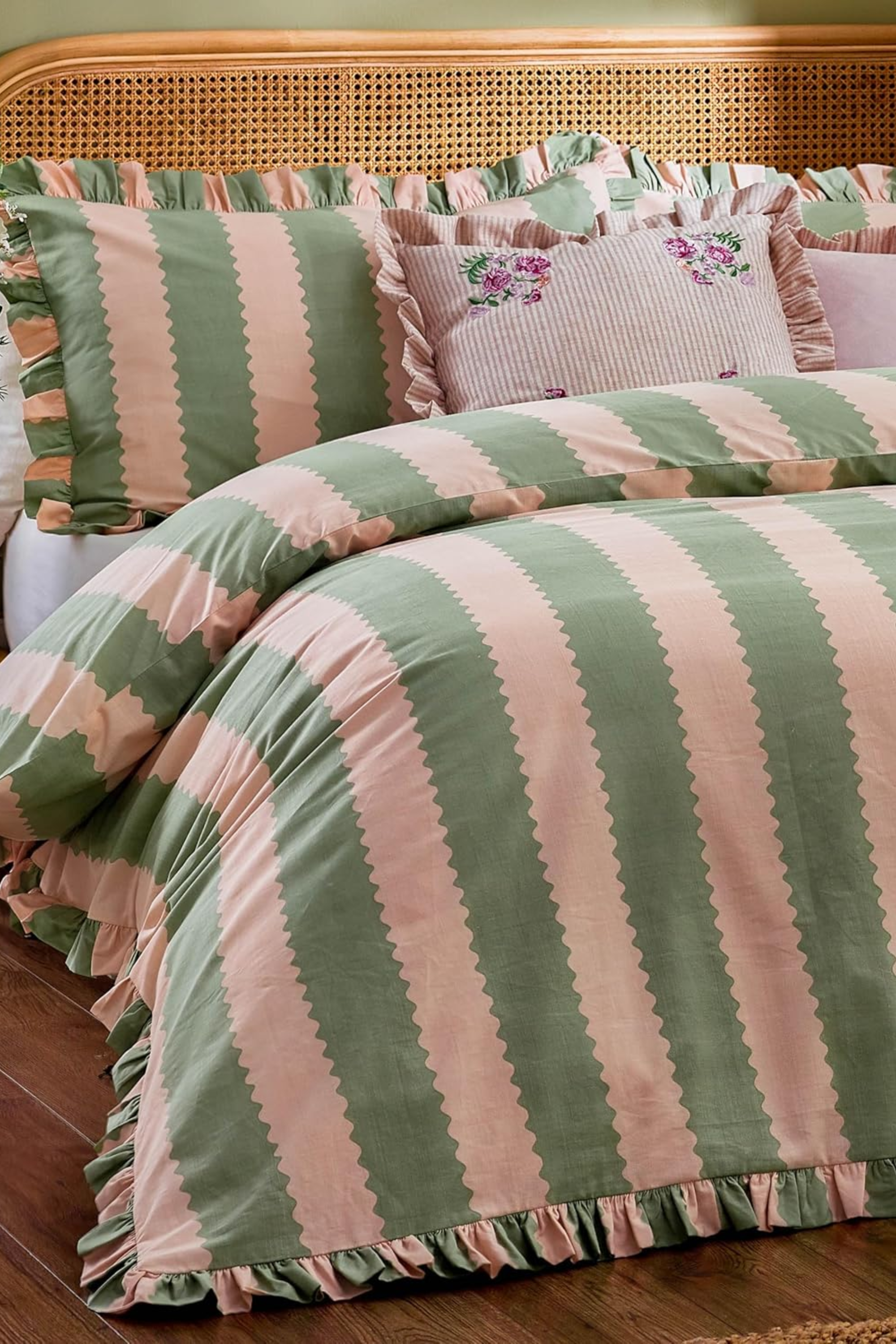 Une parure de lit rayée rose et verte, idéale pour créer une chambre colorée, cosy et pleine de personnalité.