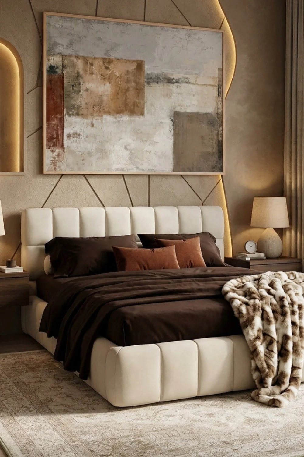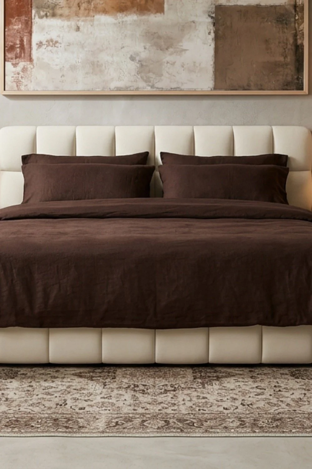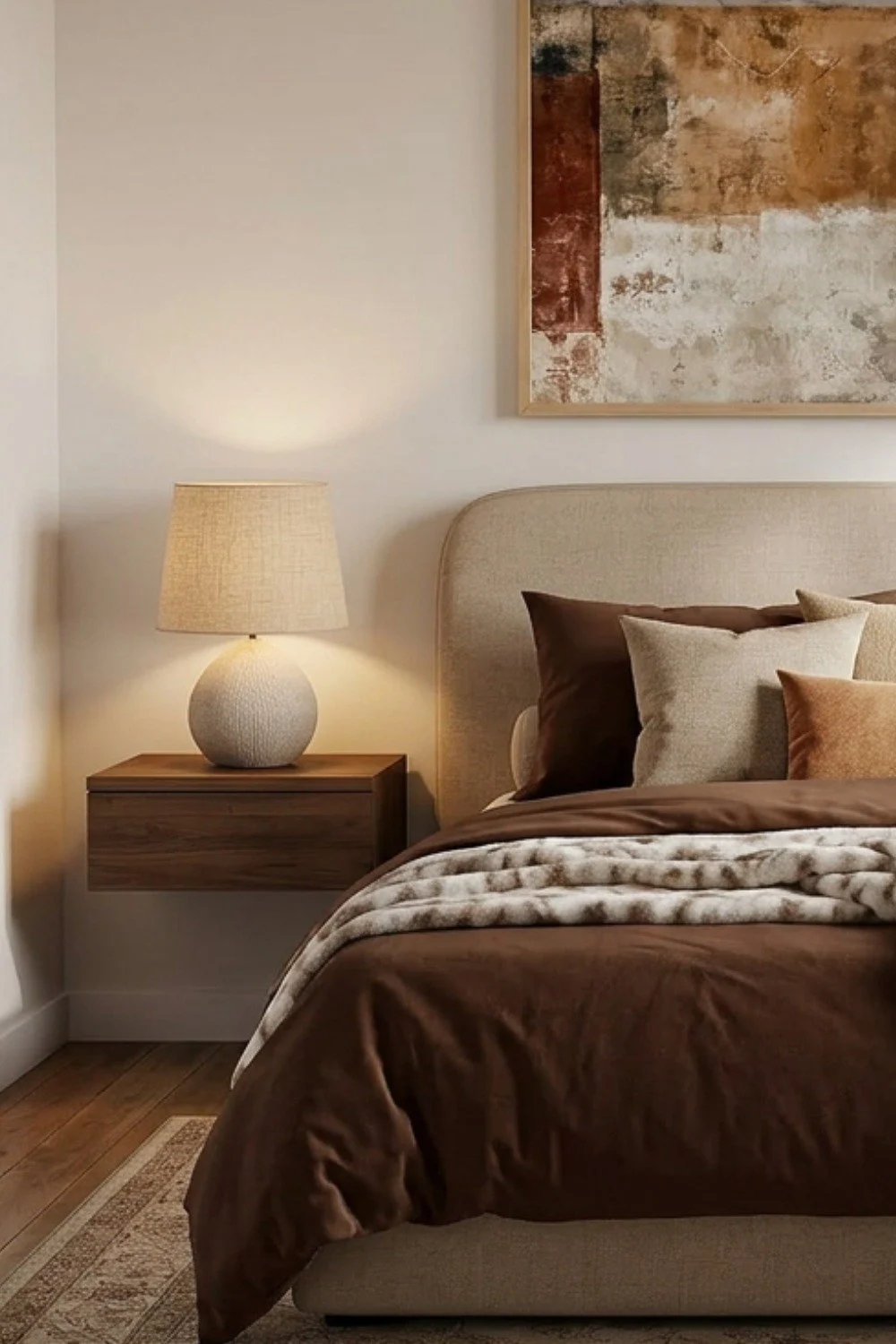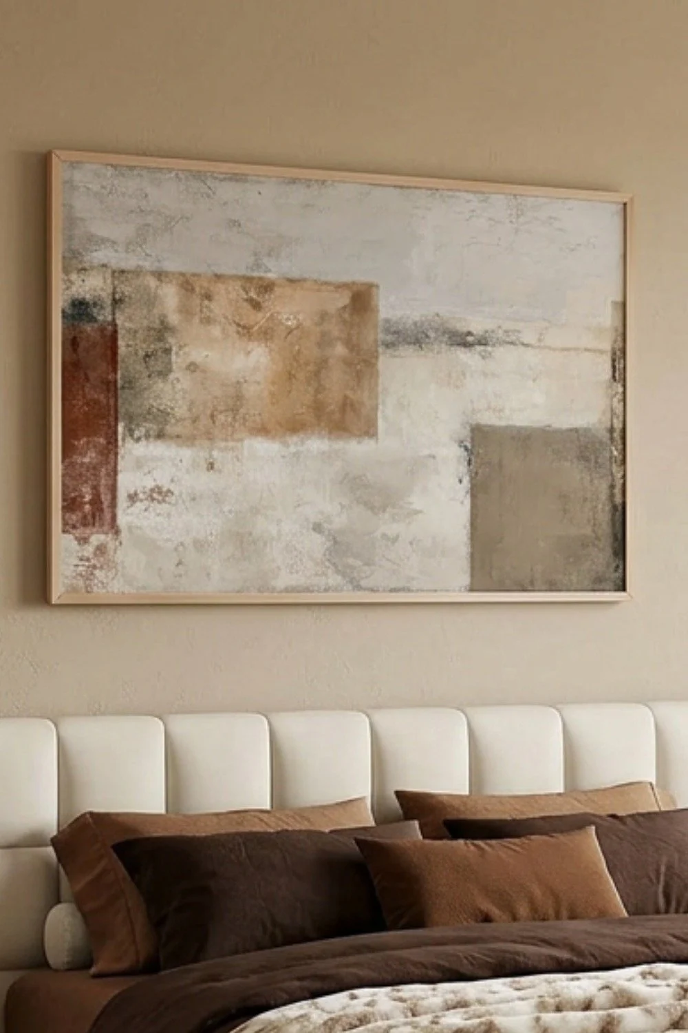 Un tableau abstrait aux tons beige et marron qui apporte une touche artistique et chaleureuse à la chambre. Ses couleurs naturelles s’intègrent parfaitement dans une décoration minimaliste et cocooning.