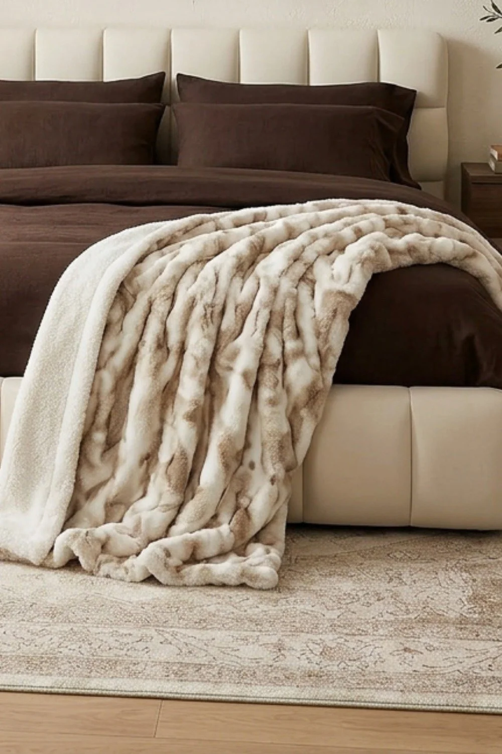 Un plaid ultra doux en fausse fourrure, parfait pour apporter une touche chaleureuse et cocooning à la chambre. Sa texture moelleuse et ses tons beige naturels créent une atmosphère confortable et élégante.